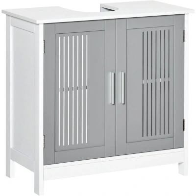 General description This kleankin under sink cabinet is designed to maximize space in your bathroom while providing a stylish storage solution. Its simple and clean design makes it suitable for various home styles. Made from durable MDF, this cabinet is built for everyday use, helping you maintain an organized space. Technical specifications Colour: White, Grey Material: MDF, Metal Overall Dimension: 60L x 30W x 60H cm Cabinet Size: 26.5L x 48H cm (for Each) Opening Slot Size: Φ16.8W x 20.9D cm, Suitable for Washbasin 57W x 27D cm Inner Shelf Size: 54W x 26.5D x 48H cm Weight Capacity: 10kg (total), 3kg (Shelf) Usage Ideal for storing cleaning supplies, shampoo, toiletry bottles, and more. Features a movable middle shelf to create two separate storage areas. Slatted doors allow for natural airflow. Other information Assembly required. Maximum load: 10kg. 'U' shaped cut-out slots designed to fit easily underneath your sink (please measure before purchasing).