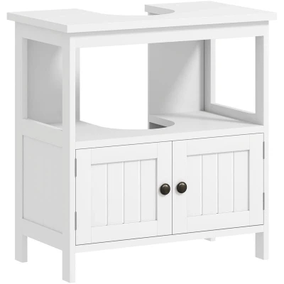General description Bathrooms are busy, communal places that often get messy with everyone's toiletries and beauty products. The kleankin Pedestal Under Sink Cabinet offers a practical solution to clutter issues. Its 'U' shaped cut-out allows it to fit neatly underneath your sink, creating previously unutilized space. This storage unit features a bottom cupboard, a middle shelf, and a flat top, providing ample room for the whole family. The bronze-tone handles add a sophisticated finishing touch. Technical specifications Colour: White Material: MDF Overall Dimension: 60W x 30D x 60H cm Opening Slot Size (Top): 20L x 8W cm Opening Slot Size (Back): 24L x 8W cm Suitable for Washbasin: 50L x 20W cm Display Shelf Dimension: 56W x 28D x 16.5H cm Inner Shelf Dimension: 57W x 28D x 28H cm Bottom to Floor: 7 cm Max Load: (Total) 30 kg, (Shelf) 5 kg Item Label: 834-358WT Usage This cabinet provides extra storage space for beauty products, spare towels, and more, making it ideal for family