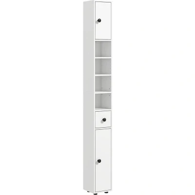 General description Small bathrooms are always in need of efficient storage. With the kleankin Slim Bathroom Cabinet, you get exactly that. This tall, narrow piece features a top and bottom cupboard, a drawer, and four open shelves, providing plenty of storage for bathroom essentials. Technical specifications Colour: White Materials: Particle Board Overall Dimension: 20W x 20D x 180H cm Top Shelf Size: 17.5W x 18D x 15H cm (each tier) Bottom Shelf Size: 17.5W x 18D x 22H cm Top Cabinet Inner: 17.5W x 16D x 17H cm (each tier) Bottom Cabinet Inner: 17.5W x 17D x 24.3H cm (each tier) Drawer Inner Size: 14.5W x 15.5D x 14.2H cm Weight Capacity: 30 kg (total), 5 kg (shelf) Installation Assembly required Anti-tipping straps included for safety Usage Ideal for storing bathroom and hygiene essentials such as towels, cleaning supplies, and toilet rolls Three-level adjustable shelves in both cupboards for customizable storage Other information Robust particle board structure with a melamine