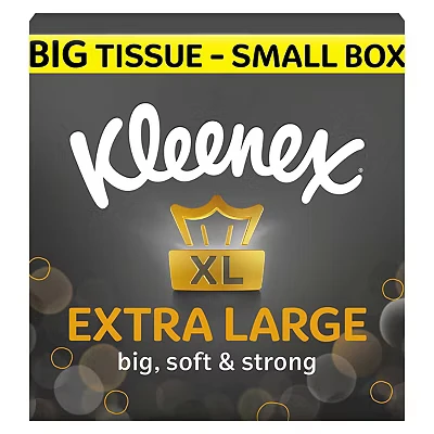 Kleenex Extra Large Compact Tissues are confidently strong and won't let you down. Super soft and gentle on your skin, they're perfect for any colds or flu.. These boxes of tissues are handy to get around your home and office. Packaging is made with 30% recycled plastic and it's still 10% recyclable.. Kleenex Extra Large Compact Tissues. 2 Packs. With a touch of silk. Confidently strong. Comfortingly soft. 100% recyclable packaging