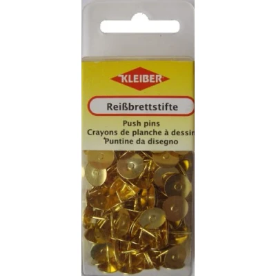 Basic drawing pins 200 pins per box Round 100 mm flat headed Brass pointed, super think for flush fitting Re-sealable patented click box for storage