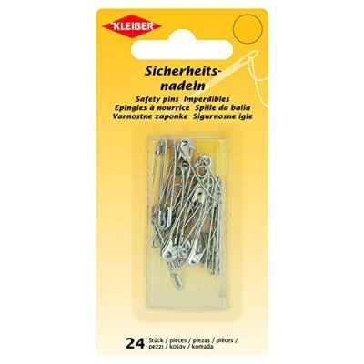 Safety pins / Baby pins Silver coloured coating Spring and clasp Two sizes 25 mm and 38 mm Re-sealable patented click box for storage