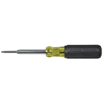 Multi-bit screwdriver with interchangeable shaft holds 4 universal tips and converts to 2 nut driver sizes Extended shafts and blades provide 39-percent longer reach Extra-long shaft provides full reach of 4 standard-blade screwdriver Small diameter shaft for comfortable grip and quick, easy turning Contains: 1/4-Inch (6 mm) slotted, #2 Phillips, 1/4-Inch (6 mm) and 5/16-Inch (8 mm) nut drivers, #1 and #2 square-recess, Weight: 0.4125 pounds, Manufacturer: Klein Tools