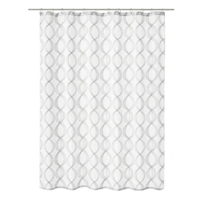 Textile shower curtain in a subtle design 100% polyester Premium satin quality Includes high-strength plastic eyelets and lead-free weighted band in the hem Machine washable up to 40 °C