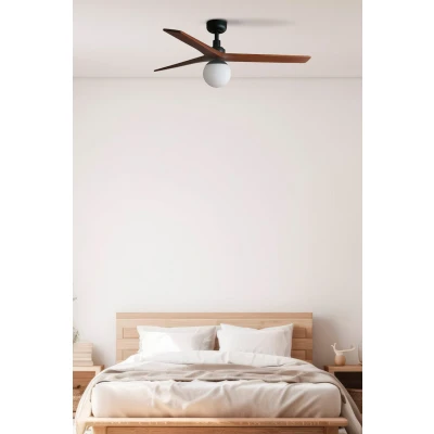 Net LightingKLIM M is an ultra-compact DC motor ceiling fan with light, designed by Faro Lab, ideal for bedrooms from 13 m² to 17,6m². This ceiling fan’s walnut wood blades envelope the motor, achieving an ultra-light effect. Activated by remote control, included. This black fan has 6 regulatable speeds, reverse function and itis suitable for a sloped ceiling.
