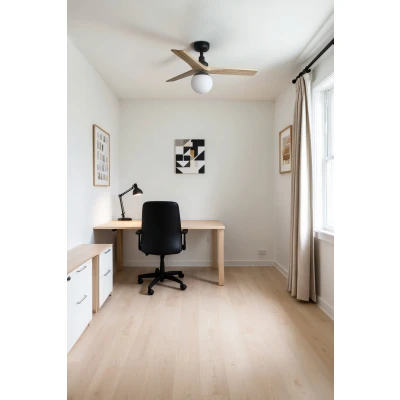 General description This KLIM S ceiling fan features a sleek design with a matt black housing and light oak blades, making it an elegant addition to any room. It is equipped with a DC motor, ensuring efficient operation and quiet performance. Ideal for bedrooms smaller than 13 m², this fan combines functionality with style. Technical specifications Voltage: 220-240 V ~ 50/60 Hz Diameter: 92.5 cm / 36" Height: 40.8 cm Ceiling to blades: 21.2 cm / 8.4" Overall drop: 33 cm / 13" Diameter canopy: 13 cm / 5.1" Weight: 3.6 kg / 7.9 lbs Motor wattage: 6.2 / 7.9 / 10.5 / 14 / 20.4 / 28.8 W Revolutions per minute: 153 / 192 / 226 / 259 / 302 / 348 Max. airflow: 124 m³/min / 4379 CFM Max. ceiling slope: 12° IP Rating: IP20 Compatibility and accessories Light source: 1 x E27 base, max. 15 W (bulbs not included) Includes remote control for fan operation Installation Suitable for sloped ceilings Usage 6 fan speeds with off function Lighting on/off control Running direction control (forward and