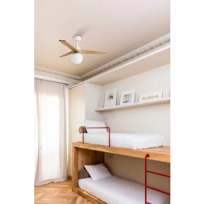 KLIM S is an ultra-compact DC motor ceiling fan with light, designed by Faro Lab, ideal for bedrooms smaller than 13 m². This ceiling fan’s pine wood blades envelope the motor, achieving an ultra-light effect. Activated by remote control, included. This white fan has 6 regulatable speeds, reverse function and itis suitable for a sloped ceiling.