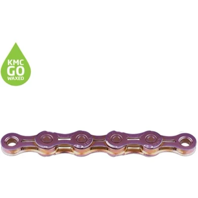 KMC's top end precision 11x chain is designed for triathlon and time trails. Perfect shifting and dynamic propulsion with the X-bridge technology, waxed with KMC GO.The unique design of each component perfectly complements speed and efficiency through swift shifting and smooth running via chain and gear tooth interference. Energy consumption is reduced via significantly increased cohesion by 9% to effectively reach and maintain top speed with less effort of all chain components working together.Thanks to the innovative formula of KMC GO CHAIN WAX, the premium KMC chains treated with this wax offer unrivalled durability and efficiency. Compared to oil-based lubricants, waxed chains are less susceptible to dirt build-up, increasing drivetrain life and reducing cleaning intervals.KMC GO Wax BenefitsLong lasting: Once applied, the wax dries to form a protective barrier that outlasts oil based productsLess dirt: Waxed chains attract less dirt, minimising the common causes of wear and ensures a smooth operation at all timesBiodegradable: Free from PFAS and harsh solventsEasy to use: Easy to apply and the chain does not need to be dewaxed before rewaxing.Specifications1/2" X 11/128"Pin Length: 5.2mm126 LinksWaxed with KMC GODouble X-BridgeNon DirectionalMissing links includedCompatible with all 11x drivetrainsWeight per 110 links: 268gRecommended Care intervalsRoad Bikes: KMC recommend to care for your KMC Waxed at the latest after 250 km or at least once a month.MTB, cross and frequent riders in all weather conditions: After 100 km at the latest.RewaxingThe chain must be dry before applying the waxThe chain does not need to be dewaxedShake the bottle and apply to the inside of the chain (One complete turn)Do not wipe off excess wax.Allow to dry completely before riding, especially in wet conditions