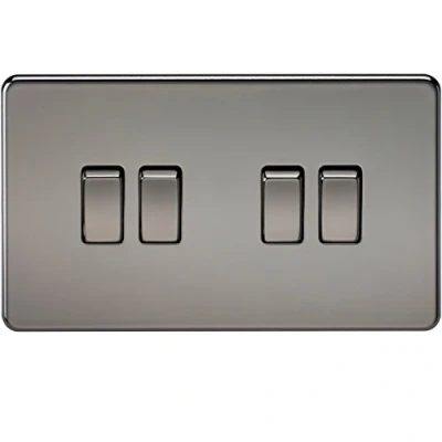 The Knightsbridge 10 Amp 4G 2 way Screwless Switch in Black Nickel is the ideal decorative upgrade for use in the modern home, businesses and hotels. The screwless design features an easy clip on cover with an internal gasket for moisture protection and matching screws. It has an ultra slim profile and is constructed from durable and high temperature resistant thermoset plastic. 10 Amp 4G 2 way Standard Electric Wall Switch Plate. Durable, scratch resistant high quality thermoset plastic with integral gasket. 4 Gang switch measurements are width 148.5mm x height 87.5mm. Minimum mounting depth of 16mm. Complies to all relevant safety standards and comes with a 15 year manufacturer guarantee and CE marked. The Screwless Wall Switches are also available in Brushed Chrome, Matt Black, Polished Brass and Polished Chrome.