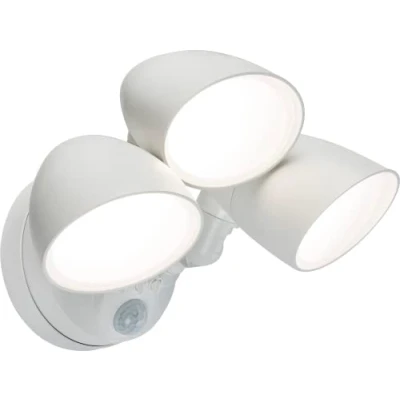 The latest in security floodlight technology, featuring user definable white light (3000K, 4000K, 5500K) by means of a selection switch. Fully featured built-in PIR with combined lux sensor providing accurate presence detection which can be overridden by a quick switch toggle, forcing the light into an always on state, removing the need for complex multi-core cables and switching arrangements. - IP65 construction for permanent outdoor installation - 5-year warranty - Wide operating voltage range 100-277Vac - 2 and 3 head options available (20W & 30W) - High quality SMD2835 LEDs - Selectable 3000K, 4000K, 5500K white light - Manual override by toggling of power switch - Adjustable sensitivity, time and lux dials - Choice of black or white finish - Simple mounting bracket with push-to-fit assembly - 90° PIR detection range - 8 metre detection distance - 70° beam angle (from each head) - 360° lamp bracket rotation, 180° lamp head rotation, 270° lamp head tiltTechnical Specification:Projection: 190Tilt: 270Rotation: 360Construction: PolycarbonateFinish: WhiteClass: IIIP Rating: IP65Primary Voltage: 110/230VDiffuser: OpalLamp Technology: SMD LEDLamp Included: YesDimmable: NoL70B50: 54000Energy Rating (Class) post 2021 SLR: EBeam Angle: 75CCT: 3000/4000/5500Light Colour: CCTLumens: 2960Lumens (Light Source only): 2960Wattage: 30Efficacy: 105CRI: >85Weight: 0.725KgWarranty: 5 Years