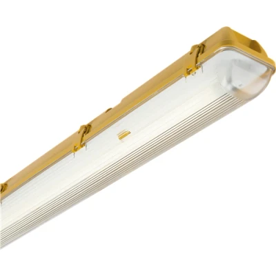 110V IP65 1x58W 5ft Single High Frequency Non-Corrosive Fluorescent Fitting with Emergency. - Brackets for surface mounting - 3 hour emergency - Supplied with 12 x fixing clips - Polycarbonate base and diffuser - Push-fit terminals Compatible with 1x58W 5ft T8 lamp (not supplied).Technical Specification:Projection (mm): 90Construction: PolycarbonateFinish: YellowClass: IIP Rating: IP65Primary Voltage: 110VDiffuser: PrismaticEmergency: Maintained / Non-maintained / SwitchedLamp Technology: FluorescentLamp Base: T8Lamp Included: NoDimmable: NoMax. Wattage: 1x58Dimensions: Length: 1563mmWeight: 2.89KgWarranty: 3 Years (excluding battery)