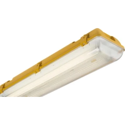 110V IP65 2x58W 5ft Twin High Frequency Non-Corrosive Fluorescent Fitting with Emergency. - Brackets for surface mounting - 3 hour emergency - Supplied with 12 x fixing clips - Polycarbonate base and diffuser - Push-fit terminals Compatible with 2x58W 5ft T8 lamp (not supplied).Technical Specification:Projection (mm): 90Construction: PolycarbonateFinish: YellowClass: IIP Rating: IP65Primary Voltage: 110VDiffuser: PrismaticEmergency: Maintained / Non-maintained / SwitchedLamp Technology: FluorescentLamp Base: T8Lamp Included: NoDimmable: NoMax. Wattage: 2x58Dimensions: Length: 1563mmWeight: 3.69KgWarranty: 3 Years (excluding battery)