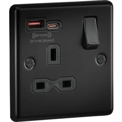 KnightsBridge 13A 1G SP Raised Round Edge Switched Socket with Dual USB A+C Matt Black, Black Insert