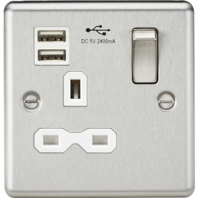 KnightsBridge 13A 1G Switched Socket Dual USB Charger Slots with White Insert Rounded Edge Brushed Chrome