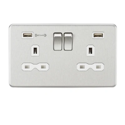 KnightsBridge 13A 2G DP Switched Socket with Dual USB Charger (Type A FASTCHARGE port) Brushed Chrome/White