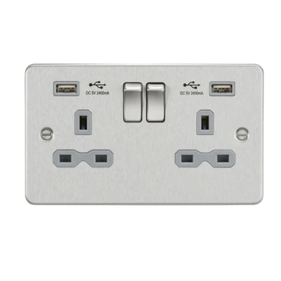 KnightsBridge 13A 2G Flat Plate switched socket with dual USB charger A + (2.4A) Brushed chrome grey insert