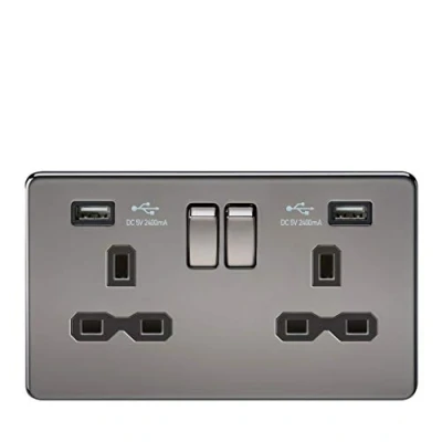 This charger socket is a great finishing touch to any modern home. Screwless low profile metal design with matching metal rockers. Built in Dual USB Charger- 13A Switched sockets- Dual USB Charging 5V DC2.4A (shared)- Screwless low profile design with built in gasket- Certified to BS1363-2:2016, EN 62368-1, EN 62680-1-1, EMC and ErP Certified - Minimum mounting box depth 25-35mm**dependent on wiring conditionsWE RECOMMEND YOU ALWAYS USE CERTIFIED USB CABLES FOR SAFETY AND TO ENSURE COMPATIBILITYSpecification: Projection (mm): 4.3Min. Mounting Box Depth (mm): 25-35mm (dependent on wiring conditions)Construction: Premium grade steelFinish: Black NickelClass: IIP Rating: IP20Primary Voltage: 230V 50HzEarth Terminal: Yes