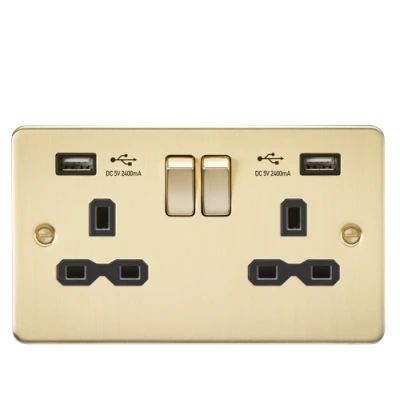 This charger socket is a great finishing touch to any modern home. Flat Plate low profile metal design with matching metal rocker. Built in Dual USB Charger - 13A Switched sockets - Dual USB Charging 5V DC2.4A (shared) - Ultra low profile design with built in gasket - Certified to BS1363-2:2016, EN 62368-1, EN 62680-1-1, EMC and ErP Certified - Minimum mounting box depth 25-35mm**dependent on wiring conditionsWE RECOMMEND YOU ALWAYS USE CERTIFIED USB CABLES FOR SAFETY AND TO ENSURE COMPATIBILITYSpecification: Projection (mm): 2.5Min. Mounting Box Depth (mm): 25-35mm (dependent on wiring conditions)Construction: Premium grade steelFinish: Brushed BrassIP Rating: IP20Primary Voltage: 230V 50HzEarth Terminal: Yes