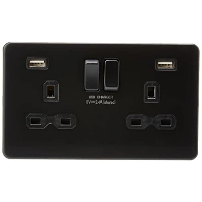 This charger socket is a great finishing touch to any modern home. Screwless low profile metal design with matching metal rockers. Built in Dual USB Charger- 13A Switched sockets- Dual USB Charging 5V DC2.4A (shared)- Screwless low profile design with built in gasket- Certified to BS1363-2:2016, EN 62368-1, EN 62680-1-1, EMC and ErP Certified - Minimum mounting box depth 25-35mm**dependent on wiring conditionsWE RECOMMEND YOU ALWAYS USE CERTIFIED USB CABLES FOR SAFETY AND TO ENSURE COMPATIBILITYSpecification: Projection (mm): 4.3Min. Mounting Box Depth (mm): 25-35mm (dependent on wiring conditions)Construction: Premium grade steelFinish: Matt BlackClass: IIP Rating: IP20Primary Voltage: 230V 50HzEarth Terminal: Yes