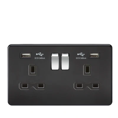 KnightsBridge 13A 2G switched socket with dual USB charger A + (2.4A) Matt black chrome Rockers