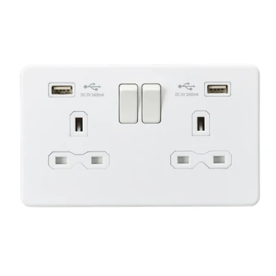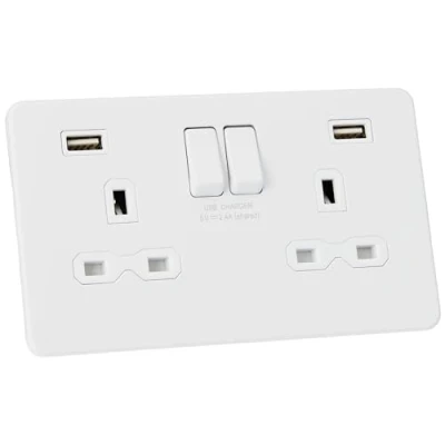 This charger socket is a great finishing touch to any modern home. Screwless low profile metal design with matching metal rockers. Built in Dual USB Charger- 13A Switched sockets- Dual USB Charging 5V DC2.4A (shared)- Screwless low profile design with built in gasket- Certified to BS1363-2:2016, EN 62368-1, EN 62680-1-1, EMC and ErP Certified - Minimum mounting box depth 25-35mm**dependent on wiring conditionsWE RECOMMEND YOU ALWAYS USE CERTIFIED USB CABLES FOR SAFETY AND TO ENSURE COMPATIBILITYSpecification: Projection (mm): 4.3Min. Mounting Box Depth (mm): 25-35mm (dependent on wiring conditions)Construction: Premium grade steelFinish: Matt WhiteClass: IIP Rating: IP20Primary Voltage: 230V 50HzEarth Terminal: Yes