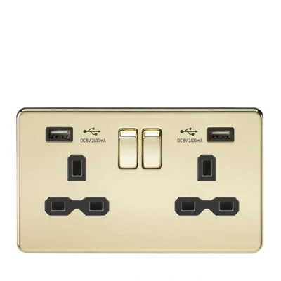 KnightsBridge 13A 2G switched socket with dual USB charger A + (2.4A) Polished brass black insert