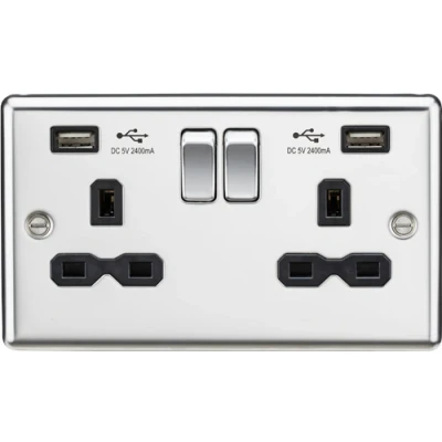 KnightsBridge 13A 2G switched socket with dual USB charger A + (2.4A), Polished chrome black insert