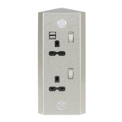 The perfect solution for unused corners on kitchen counter tops, fitted cabinet corners in bedrooms and hotel rooms. This unit mounts vertical and offers power and a USB charging solution. Includes a universal smart phone holder with integral cable management feature that can be installed in the top fixing position if desired. - 13A Rated - 2G Switched sockets - Built in dual USB Charger 5V DC 2.4A (shared) - Matching metal rockers - Suitable for corner mounting - Stainless Steel with black interior - Certified to BS1363-2:2016, EN 62368-1, EN 62680-1-1, EMC and ErP Certified WE RECOMMEND YOU ALWAYS USE CERTIFIED USB CABLES FOR SAFETY AND TO ENSURE COMPATIBILITYTechnical Specification:Projection (mm): 67Construction: Premium grade steelFinish: Stainless SteelClass: IIP Rating: IP20Primary Voltage: 230V 50HzEarth Terminal: YesDimensions: Height: 236mmWeight: 0.8KgWarranty: 1 Year