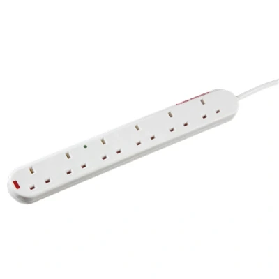 Domestic use surge protected extension lead. - 13A 240V AC - 6 x child protected sockets - Surge protected - With surge and neon power indicators - L-N type surge protection with 2 x MOVs plus one gas tube arrestor - Compact low profile design with angled socket edge to facilitate better cable management and prevent loaded sockets tipping extension lead. - Matt white finish - Approx. 2m cable length with BS plug top - Certified to BS 5733, EN 61643 - Supplied in Knightsbridge clip close polybagTechnical Specification:Construction: Thermoset resinFinish: WhiteIP Rating: IP20Primary Voltage: 230V 50HzCable Length: 2Neon Indicator: YesDimensions: Length: 354mm x Height: 28mmWeight: 0.45KgWarranty: 1 Year