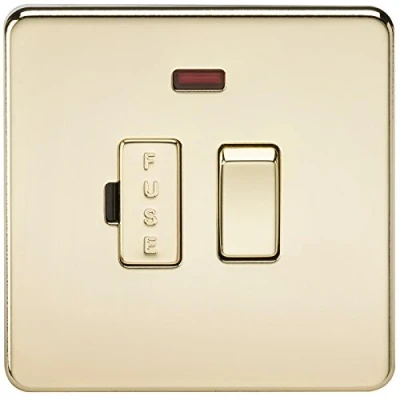 The Knightsbridge SF6300NPB Screwless switched fused spur unit or fused connection unit with neon in Polished Brass. An electrical switch with a built in 13 amp fuse designed for appliances that do not have or require a fused plug top. Fused spur units are also used for high powered electrical equipment with heavy continuous loads, so that the appliance can be isolated by a single cable from a ring main for safety and maintenance purposes. The decorative plate features an easy clip on cover with internal gasket for moisture protection and matching screws. It has an ultra slim profile and is made from high quality ultra slim, premium grade material and complete with integral gasket. A light weight and compact unit with measurements Width 87.5mm x Height 87.5mm with a minimum mounting depth of 25mm. Complies to all relevant safety standards and comes with a 15 year manufacturer guarantee. This product is also available in Brushed Chrome, Black Nickel, Matt Black and Polished Chrome.
