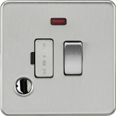 Elegant Brushed Chrome Finish: Premium screwless, low-profile metal faceplate with a refined brushed chrome finish for a modern, high-end appearance. Reliable 13A Performance: Rated at 13 amps and fitted with a matching fused holder, providing dependable protection for fixed appliances. Switched with Neon Indicator: Integrated rocker switch with neon light for clear power status visibility and added user convenience. Integrated Flex Outlet: Built-in flex outlet ensures a neat, secure cable exit, ideal for permanent appliance connections. Certified & Easy to Install: Manufactured to BS 1363-4 standards, complete with built-in gasket and suitable for a minimum 25mm mounting box depth.