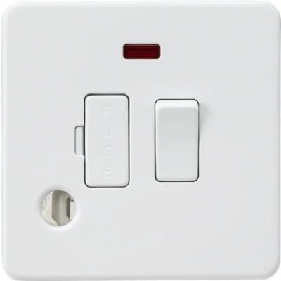 Sleek Screwless Design: Contemporary low-profile metal faceplate in matt white, delivering a flawless finish that complements modern interiors. Reliable 13A Performance: Rated at 13 amps and fitted with a matching fused holder, providing dependable protection for fixed appliances. Switched with Neon Indicator: Integrated rocker switch with neon light for clear power status visibility and added user convenience. Integrated Flex Outlet: Built-in flex outlet ensures a neat, secure cable exit, ideal for permanent appliance connections. Certified & Easy to Install: Manufactured to BS 1363-4 standards, complete with built-in gasket and suitable for a minimum 25mm mounting box depth.
