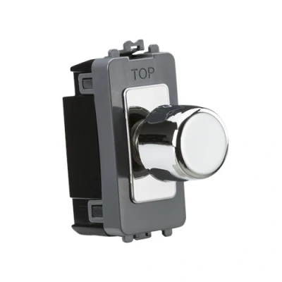 1G 2-way trailing edge dimmer module for use with the Knightsbridge Screwless or Flat Plate systems. - 10-200W Incandescent - 10-100W LED - 2-way - Press on/off operation - Trailing edge dimmer technology - Certified to EN 60669-2 NB: PLEASE CHECK WITH LAMP MANUFACTURER FOR COMPATIBILITY WE RECOMMEND A MAXIMUM OF 10-12 LAMPS PER GRID DIMMER TO PREVENT ANY INRUSH CURRENT PROBLEMSTechnical Specification:Projection (mm): 23Recessed Depth (mm): 22Min. Mounting Box Depth (mm): 35mmConstruction: ABSFinish: Polished ChromeIP Rating: IP20Primary Voltage: 230V 50HzDimensions: Height: 56mmWeight: 0.039KgWarranty: 3 Years