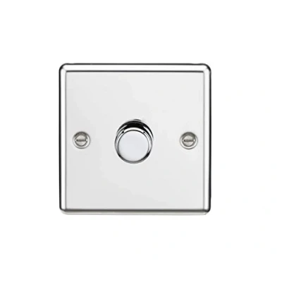 Electrical WorldPerfect finishing touch to any modern home, rounded edge metal design with matching metal cap 10-200W incandescent10-150W mains voltage halogen10-150W LV halogen with electronic transformer5-150W LED dimmable lamp2-wayPush on/offRotary action dimmerAnti-FlickerTrimming functionSwitchable from Trailing Edge to Leading EdgeOverload and Over Temperature protectionInrush Current Limiter (ICL)NB: PLEASE CHECK WITH LAMP MANUFACTURER FOR COMPATIBILITYTechnical SpecificationHeight: 85.75Width: 85.75Projection: 7.5Min. Mounting Box Depth: 25mmConstruction: Premium grade steelFinish: Polished ChromeClass: IIP Rating: IP20Primary Voltage: 230V 50HzEarth Terminal: YesTerminal: ScrewTechnical Specification:IP Rating: IP20 Colour: Polished ChromeDimensions: Height: 86mmWeight: 0.135KgWarranty: 2 Years