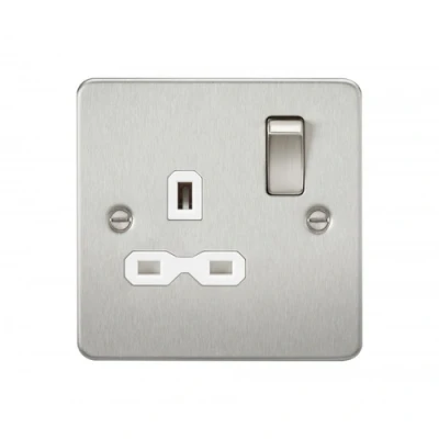 1G DP Switched Flat Plate Socket - Brushed Chrome, White Insert Perfect finishing touch to any modern home, ultra-low profile Flat Plate metal design with matching metal rocker, unique socket insert design that is completely hidden once a plug is inserted. 13A 1G Switched Socket Double Pole Switch Flat Plate low profile design with built in gasket Certified to BS 1363:2 Minimum mounting box depth 25mm Dimensions: H 87.5mm x W 87.5mm IP20
