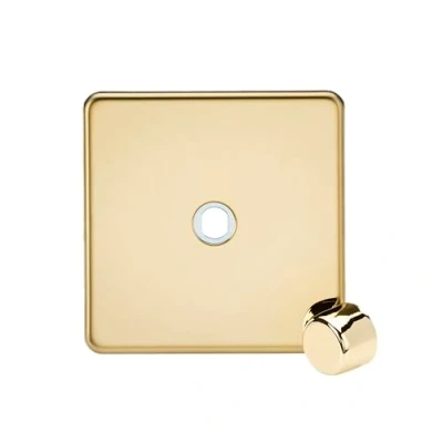Perfect finishing touch to any modern home, flawless Screwless low profile metal design with matching dimmer cap. 1G dimmer plate and matching dimmer capUnpopulatedScrewless design with built in gasketSuitable for use with centre or offset dimmer modulesTechnical SpecificationHeight: 87.5Width: 87.5Projection: 4.3Construction: Premium grade steelFinish: Polished BrassIP Rating: IP20Earth Terminal: YesTechnical Specification:IP Rating: IP20 Colour: Polished BrassDimensions: Height: 88mmWeight: 0.156KgWarranty: 25 Years
