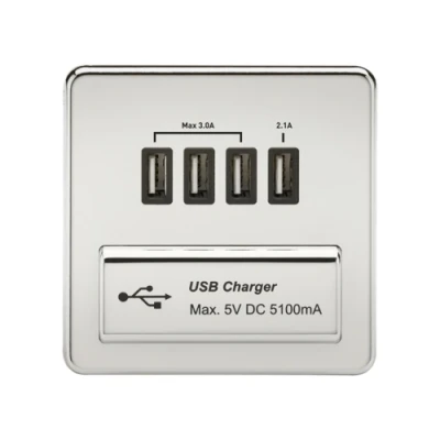 The Knightsbridge SFQUADPC Polished Chrome Screwless Quad USB Outlet is ideal for use in the modern home, businesses and hotels. The screwless design features an easy clip on cover with an internal gasket for moisture protection and matching screws. It has an ultra slim profile and is constructed from durable, and high temperature resistant thermoset plastic. USB Sockets with Black or White Socket Insert option. Quad USB charger function (5V DC 5.1A), one 2.1A port for high power devices (ipads and tablets) and 3A shared on 3 ports for smaller devices. Overload and short circuit protection facility. Made from thermoset plastic with polished chrome finish. IP Rating: IP20. The socket is compact in design, measuring 87.5mm wide x 87.5mm high and requires a minimum mounting depth of 25mm. It complies with all relevant British Safety standards and EMC certified. Some other products that may also be of interest from this range: Quad USB Brushed Chrome.