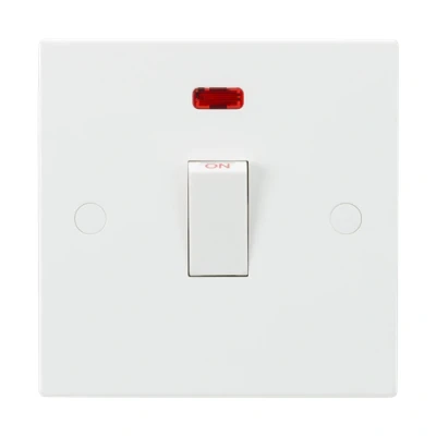 Hard wearing, all purpose Square Edge 9mm plate with anti-microbial properties - 20A rated- Double Pole- Flex outlet from base- With neon indicator- Includes screw cap covers- Certified to EN 60669-1- Supplied in Knightsbridge rip top polybag with euro slotSpecification: Projection (mm): 9Min. Mounting Box Depth (mm): 25mmConstruction: Thermoset resinFinish: WhiteIP Rating: IP20Primary Voltage: 230V 50HzEarth Terminal: YesNeon Indicator: Yes
