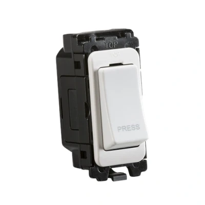 Electrical WorldDesigned and finished to coordinate with the Curved Edge Switches and Sockets range. - 20AX rated- 2-way retractive switch- Front mounting grid module- Rocker cover laser printed with PRESS- Supplied in Knightsbridge rip top polybag with euro slotFOR USE WITH CURVED GRID SYSTEM ONLYSpecification: Depth (mm): 25Recessed Depth (mm): 20Min. Mounting Box Depth (mm): 35mmConstruction: Thermoset resinFinish: WhiteIP Rating: IP20Primary Voltage: 230V 50Hz