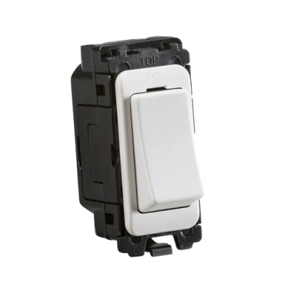 Designed and finished to coordinate with the Curved Edge Switches and Sockets range. - 20AX rated- 2-way switch- Single Pole- Front mounting grid module- Rocker cover can easily be switched for one with a designation (sold separately)- Supplied in Knightsbridge rip top polybag with euro slotFOR USE WITH CURVED GRID SYSTEM ONLYSpecification: Depth (mm): 25Recessed Depth (mm): 20Min. Mounting Box Depth (mm): 35mmConstruction: Thermoset resinFinish: WhiteIP Rating: IP20Primary Voltage: 230V 50Hz