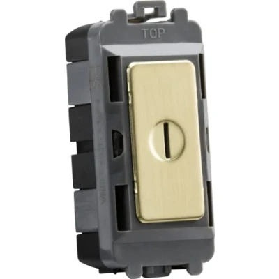 Key Switch module. Module simply clips into position from the front of the mounting frames (sold separately) - 20AX - Double Pole - Includes Key (spares available order code GDKEY) - For use with the Knightsbridge Grid SystemTechnical Specification:Projection: 2.5Recessed Depth: 18.7Min. Mounting Box Depth: 35mmConstruction: ABS & steelFinish: Brushed BrassIP Rating: IP20Primary Voltage: 230V 50HzDimensions: Height: 56mmWeight: 0.023KgWarranty: 15 Years