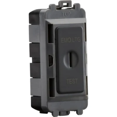 Key Switch module marked EMG LTG TEST. Module simply clips into position from the front of the mounting frames (sold separately) - 20AX - Double Pole - Includes Key (spares available order code GDKEY) - For use with the Knightsbridge Grid SystemTechnical Specification:Projection (mm): 2.5Recessed Depth (mm): 17.3Min. Mounting Box Depth (mm): 35mmConstruction: ABSConstruction 2: & steelFinish: AnthraciteIP Rating: IP20Primary Voltage: 230V 50HzDimensions: Height: 56mmWeight: 0.023KgWarranty: 15 Years