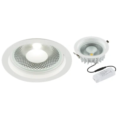 230V 15W COB LED round recessed commercial dimmable downlight. COB LED technology. High output reflector. Anti-glare fascia. Ideal for use as an alternative to traditional PL downlights. Energy efficient with almost zero maintenance required. For retail, office, conference rooms, and many commercial applications. Supplied complete with plug & play constant current dimmable LED driver. - Cool White, 4000K, 1780lm. Dimmable with most trailing edge dimmers (please check compatibility prior to installation).Technical Specification:Diameter (mm): 195Recessed Depth (mm): 70Minimum Void: 100Cut-out Diameter: 175Construction: AluminiumConstruction 2: & polycarbonateFinish: WhiteClass: IIIP Rating: IP20Primary Voltage: 230V 50HzCable Length: 0.3Diffuser: ClearLamp Technology: CoB LEDLamp Included: YesDimmable: Trailing-edge only*L70B50: 30000Beam Angle: 110CCT: 4000Light Colour: Cool WhiteLumens: 1780Wattage: 15Efficacy: 142.3CRI: >80Driver Type: Constant CurrentWeight: 0.79KgWarranty: 3 Years