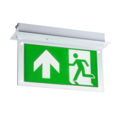 230V IP20 LED Recessed Exit sign - Ceiling mounting - 3 hour emergency - Maintained or non-maintained use (cannot be wired for switched-maintained use) - Supplied as standard with Arrow Up legend Ranges of legends available separatelyTechnical Specification:Projection (mm): 170Recessed Depth (mm): 40Minimum Void: 50Cut-out Box W/H/D (mm): 310 x 48Construction: PolycarbonateFinish: WhiteClass: IIIP Rating: IP20Primary Voltage: 230V 50HzEmergency: Maintained / Non-maintained (not Switched)Lamp Technology: SMD LEDLamp Included: YesDimmable: NoCCT: 6000Light Colour: DaylightLumens: 15Lumens (Em. mode): 8Wattage: 2Efficacy: 6.59Dimensions: Length: 335mmWeight: 0.82KgWarranty: 3 Years (excluding battery)