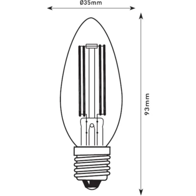 230V 4W ES (E27) LED Filament Clear Candle Lamp- 35mm LED filament technology to replicate the look of a traditional incandescent lamp. - Replacement for a 40W incandescent lamp - Dimmable - 2700K, Warm white, 380lm *Compatible with most trailing edge dimmer, please check compatibility before installationTechnical Specification:Diameter (mm): 35Construction: GlassIP Rating: IP20Primary Voltage: 230V 50HzDiffuser: ClearLamp Technology: LED FilamentLamp Base: E27Dimmable: Yes*CCT: 2700Light Colour: Warm WhiteLumens: 380Wattage: 4Efficacy: 102.05CRI: >80Dimensions: Height: 93mmWeight: 0.026KgWarranty: 2 Years