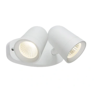 230V IP65 18W LED twin spot floodlight in white * 2 x 9W individual adjustable heads * Die-cast aluminum construction 3500K, 1455lmTechnical Specification:Projection (mm): 150Construction: Die-cast aluminiumFinish: WhiteClass: IIP Rating: IP65Primary Voltage: 230V 50HzDiffuser: ClearLamp Technology: CoB LEDLamp Included: YesDimmable: NoL70B50: 50000Beam Angle: 45CCT: 3500Light Colour: WhiteLumens: 1455Wattage: 18Efficacy: 76.6CRI: >85Dimensions: Height: 104mmWeight: 1.049KgWarranty: 3 Years