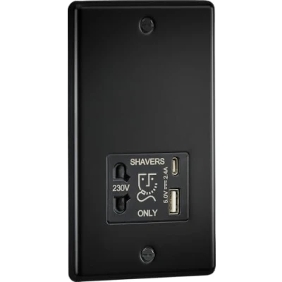 Electrical WorldProvides a desirable decorative touch to any home, contemporary rounded edge metal design. Perfect upgrade to any bathroom.230VAC 20VAIP41Single Voltage Shaver SocketScrewless low profile design with built in gasketBuilt in dual USB charger with Type-A and Type-C connections (5V DC 2.4A) (shared)Certified to EN 61558Minimum mounting box depth: 47mmTechnical SpecificationHeight: 146.5Width: 87.75Projection: 7.5Min. Mounting Box Depth: 47mmConstruction: Premium grade steelFinish: Matt BlackClass: IIP Rating: IP20Primary Voltage: 230V 50HzTerminal: ScrewTechnical Specification:IP Rating: IP20 Colour: Matt BlackDimensions: Height: 147mmWeight: 0.762KgWarranty: 2 Years