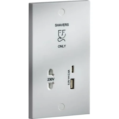 Hard wearing, all purpose Square Edge 9mm plate with anti-microbial properties Single Voltage Shaver Socket Built in dual USB charger with Type-A and Type-C connections (5V DC 2.4A) (shared) Minimum mounting box depth: 47mm Certified to EN 61558