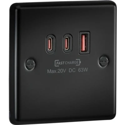 KnightsBridge 230V Triple USB Charger Raised Round Edge Plate 2xUISB C 1xUSB A Matt Black