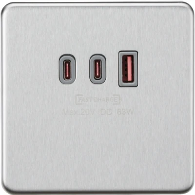KnightsBridge 230V Triple USB Screwless Charger Plate 2xUSB C 1xUSB A Brushed Chrome, Grey Insert